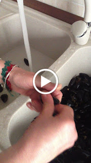 2. хорошо помыть мидии, потерев друг о друга;Consiglio: при необходимости можно хранить мидии несколько дней: выполнить пункт 2, выложить в миску, накрыть мокрым полотенцем, сжать (должны быть хорошо прижаты друг к другу) и поставить в холодильник.